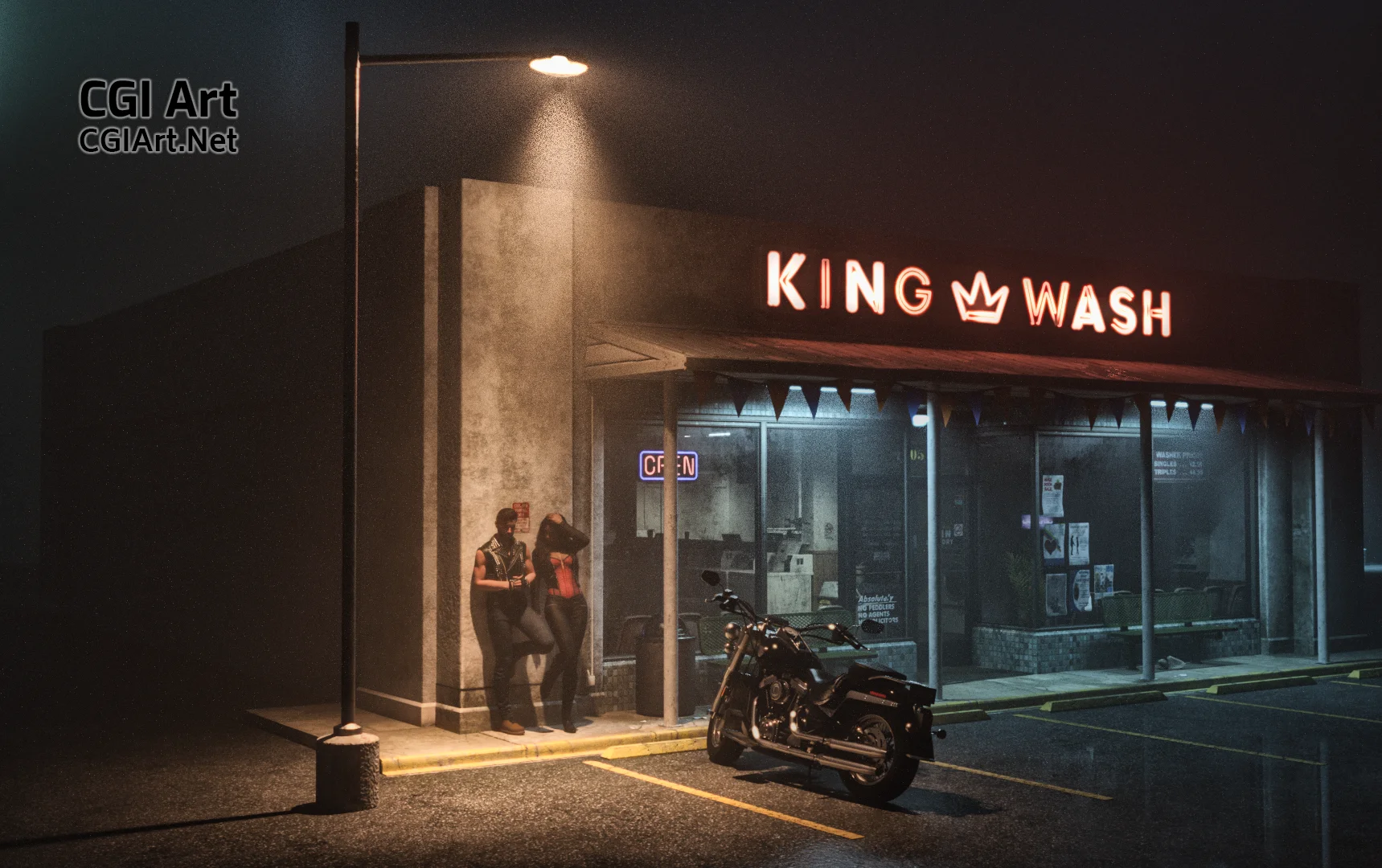 Two bikers waiting for their laundry to get done in a misty, partially drizzly, night.